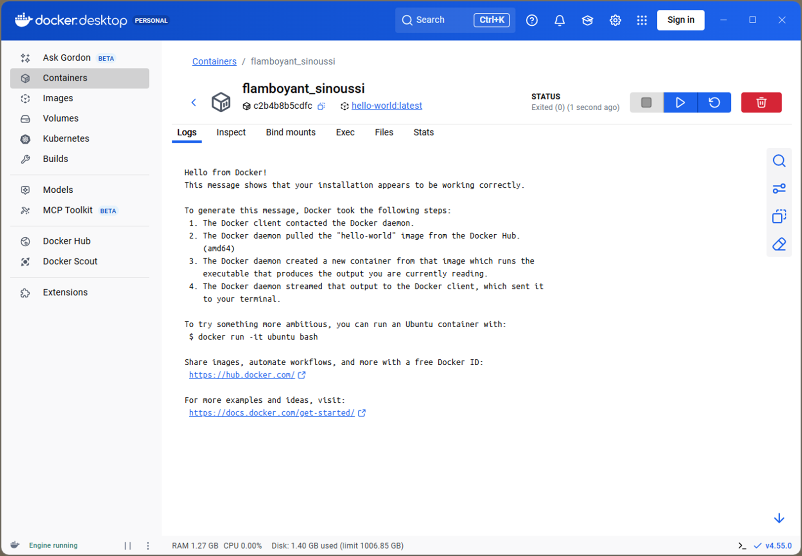 • hello-world 이미지는 다운로드되어 로컬에 저장