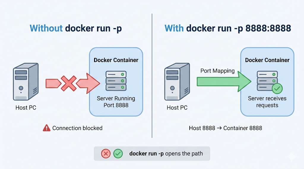 - Docker가 그 요청을 컨테이너 내부 8888 포트로 전달