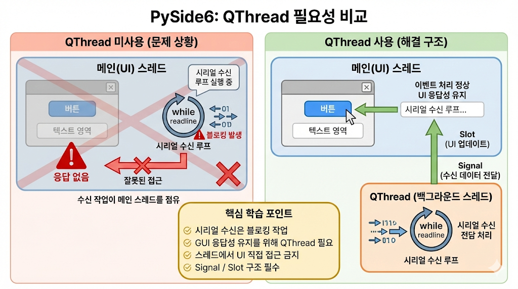 - PySide6에서 시리얼 데이터를 QThread 기반 비동기 수신으로 처리할 수 있다.