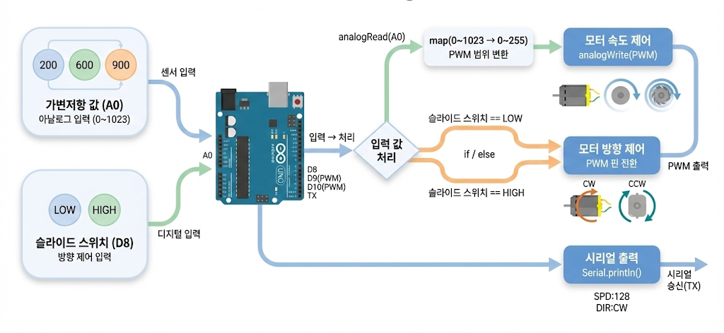 - map() 함수를 사용해 아날로그 값을 PWM 범위(0~255)로 변환할 수 있다.