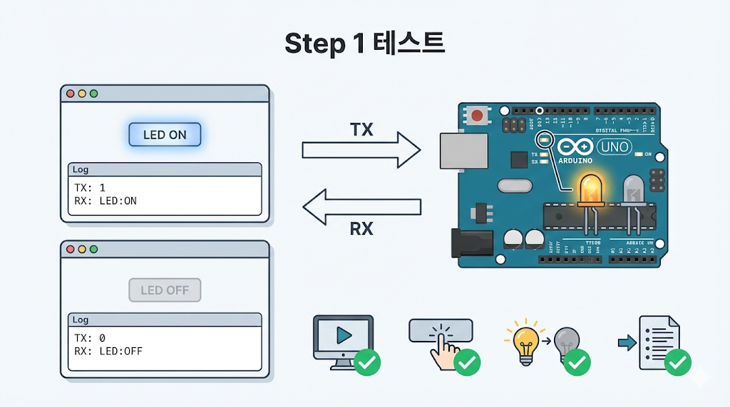 - GUI → 시리얼 → 아두이노 → 응답 흐름을 눈으로 확인한다.