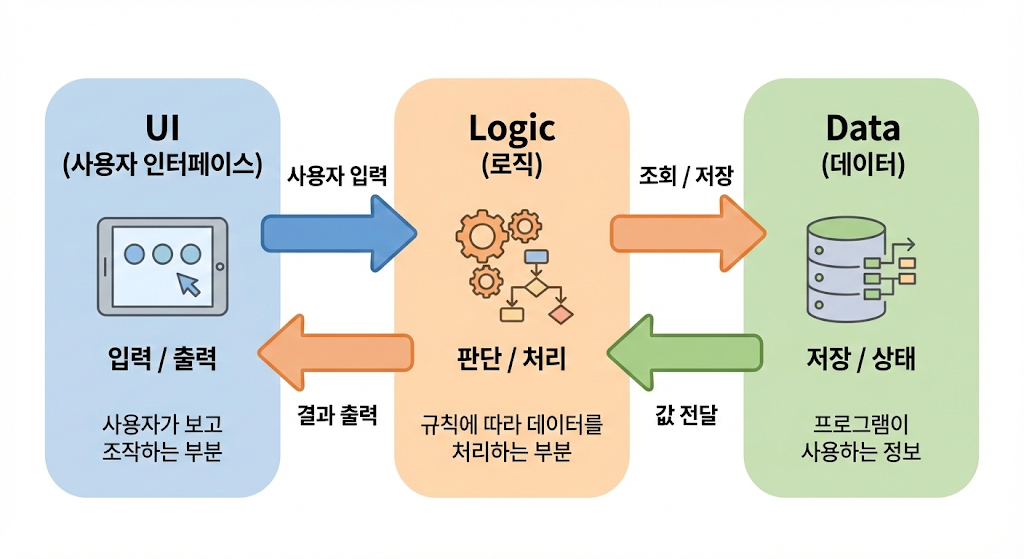 여기에 실제 사용자 프로그램에서는 UI(사용자 인터페이스)가 추가되어 3요소 구조가 된다.
