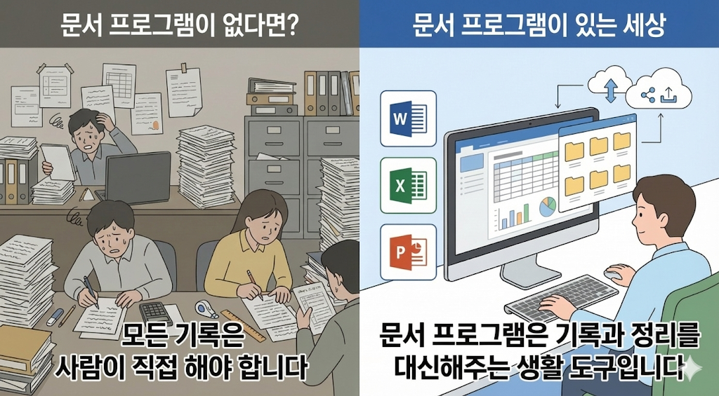 컴퓨터 화면에 글자를 입력하고, 틀리면 백스페이스 키로 지우고 다시 씁니다. 작성한 내용은 파일로 저장해 이메일로 즉시 전송하거나 프린터로 깨끗하게 출력합니다. 복잡한 계산도 수식 한 번이면 자동으로 해결됩니다.